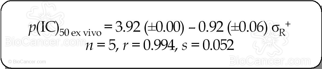Donde p(IC)50 ex vivo = -log IC50, de forma que el compuesto con mayor valor de p(IC)50 es el más potente, n es el número de compuestos, r es el coeficiente de correlación y s la desviación estándar. De esta ecuación se puede deducir la tendencia a aumentar la actividad cuando es posible deslocalizar la carga a través del sustituyente R.